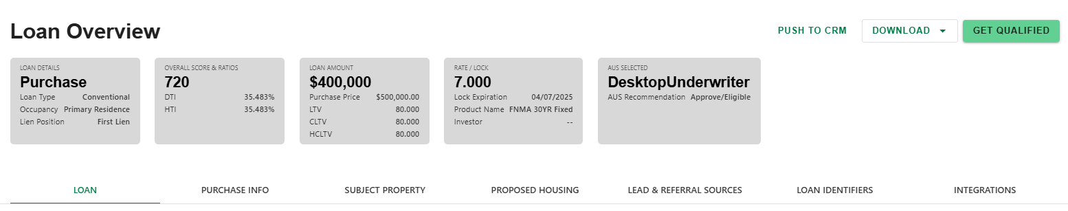 - Buttons to push information to CRM, download an XML and access Get Qualified to prequal your borrower