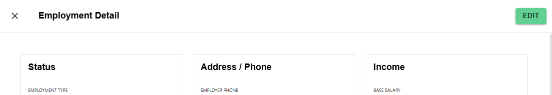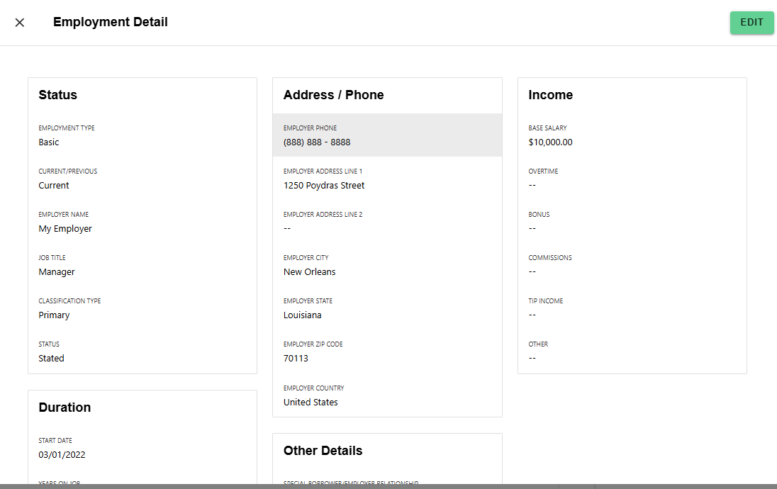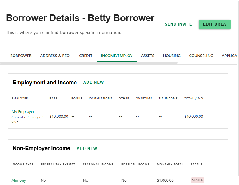 Borrower level Employment and Income can also be viewed on the URLA by clicking on 'EDIT URLA' on the Borrower Detail screen.