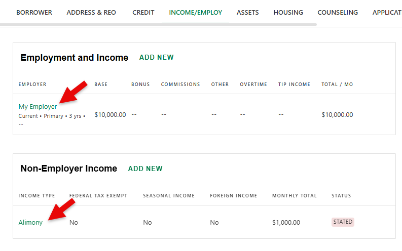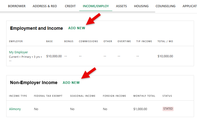 - All Borrower Income and Employment, including Non-Employer Income, can be viewed in the Income/Employ tab.
