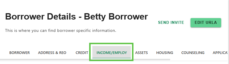 - On the Borrower Details screen, click on the INCOME/EMPLOY tab.