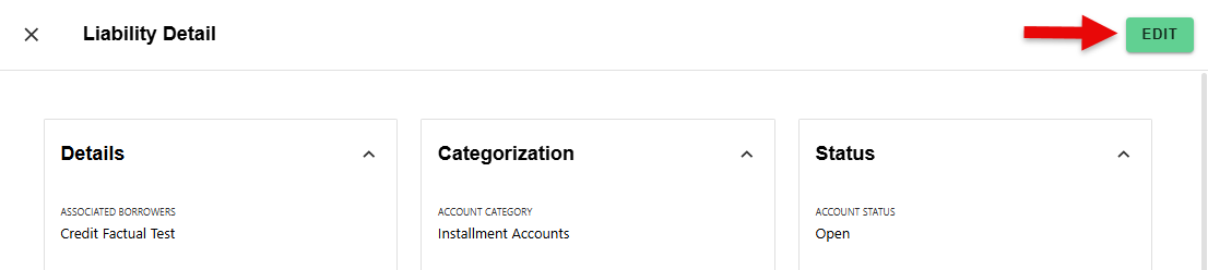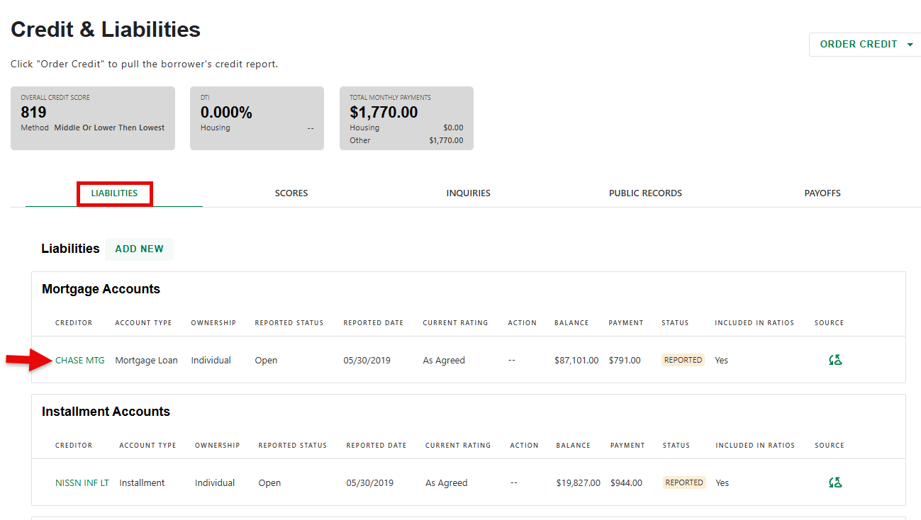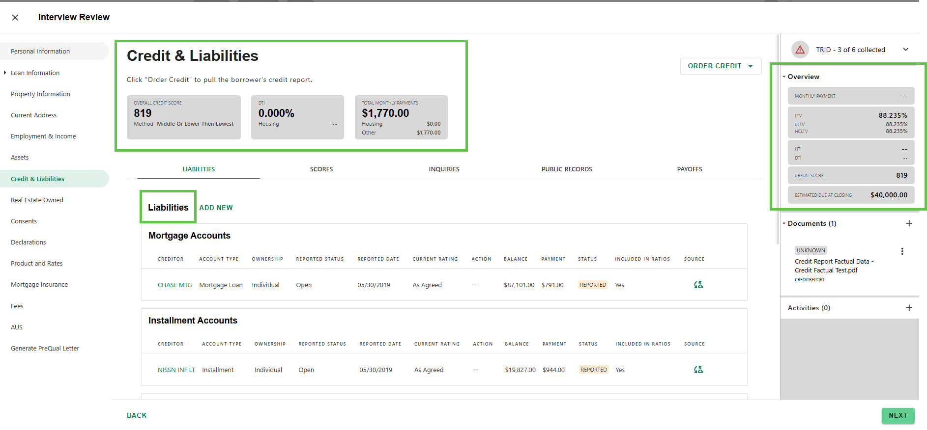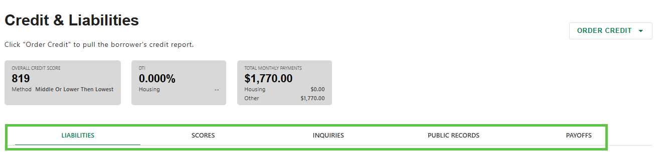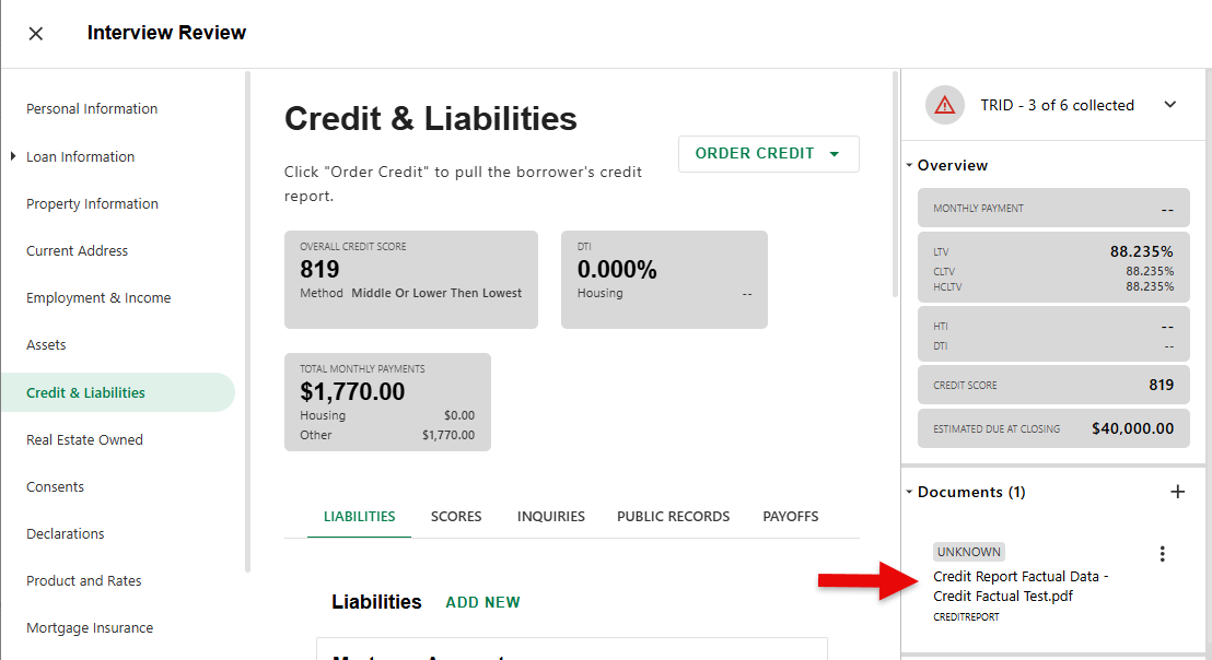 Once the Credit Order is returned, the Credit & Liabilities screen will be updated automatically with Liability details and overall loan level credit information in the Info Cards and in the Overview.