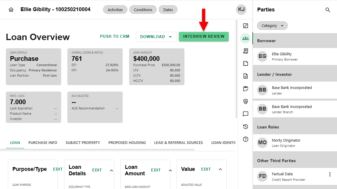 From the main Loan Overview screen, click on the 'INTERVIEW REVIEW' button.