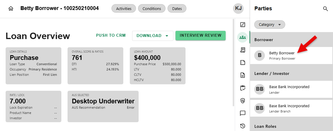 - To begin, click on a Borrower from the list in the Parties Overview side sheet.