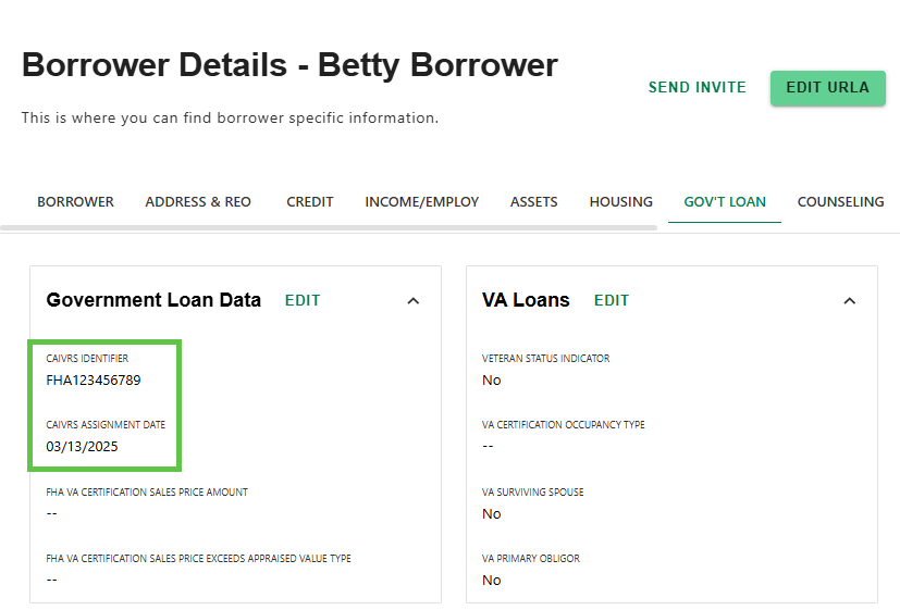 - View the CAIVRS IDENTIFIER and CAIVRS ASSIGNMENT DATE in the Government Loan Data section.