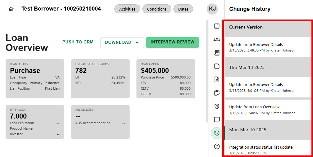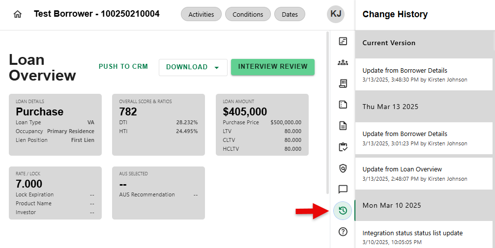 - From anywhere in the loan, navigate to the side sheet and click on the Change History icon.