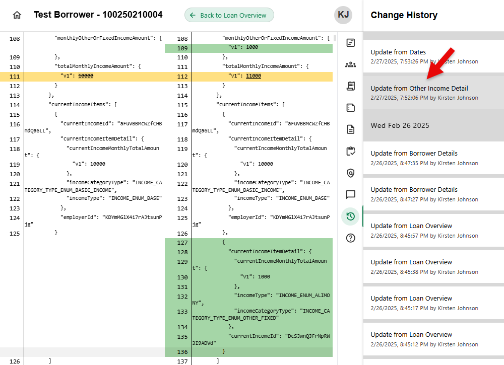 - Select Update to view details. Changes from the previous fields are highlighted. Example below shows Other Income added to the loan.