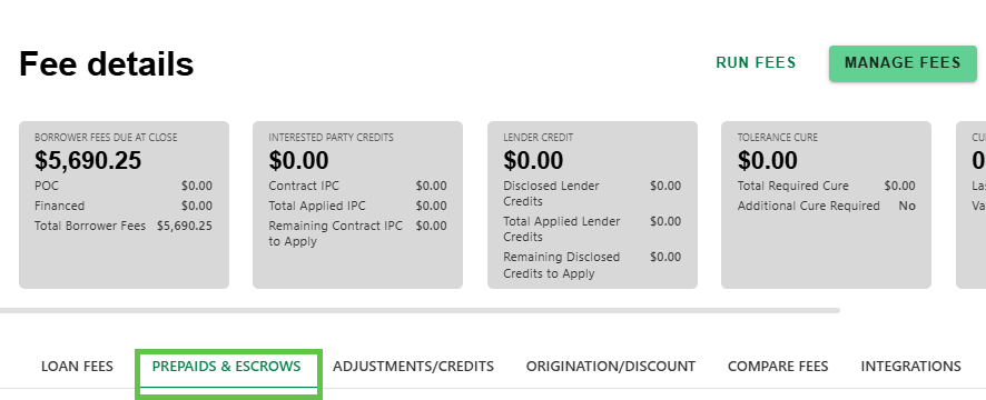 - On the Fee Detail screen, click on the PREPAIDS & ESCROWS tab