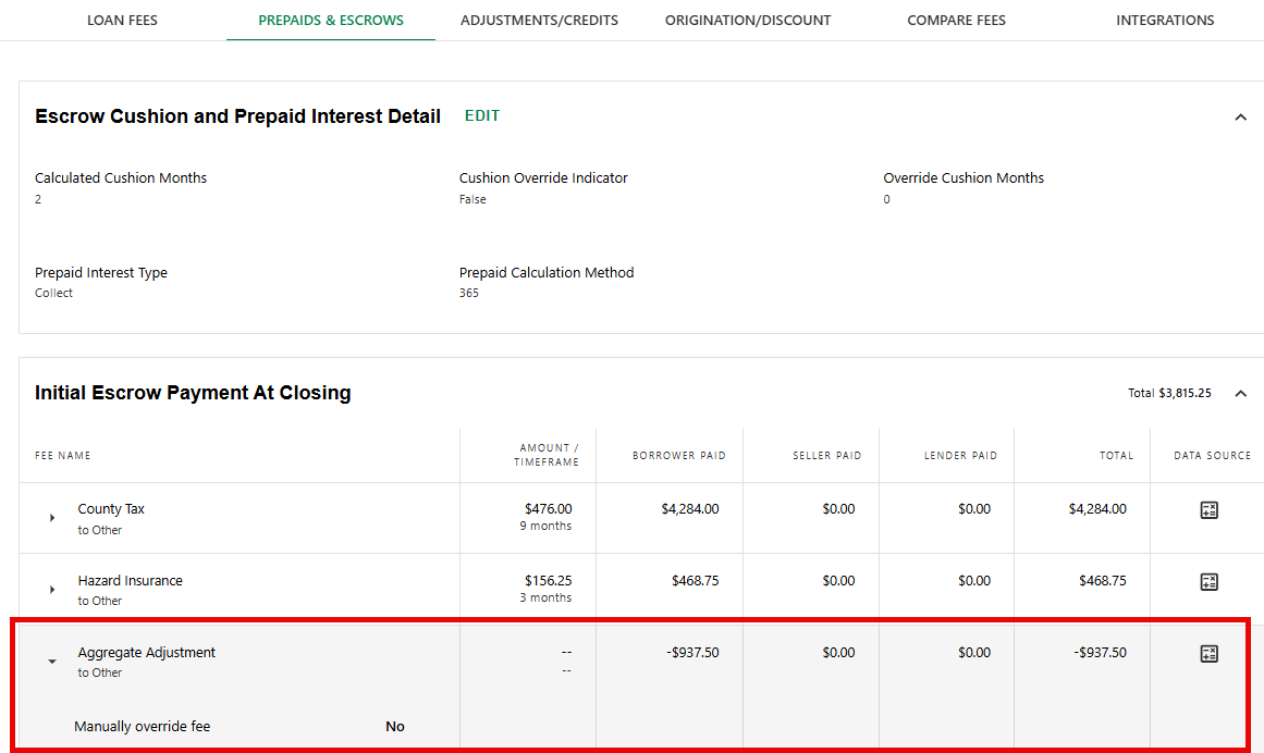 - View the calculated Aggregate Adjustment on the PREPAID & ESCROWS details screen in the Initial Escrow Payment at Closing section.