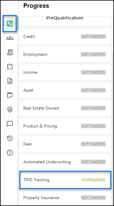 - Navigate to the TRID Tracking Progress Item located in the Progress Item Sidesheet.