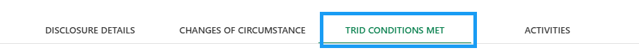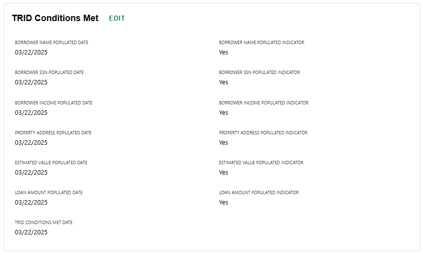 - The 'TRID CONDITIONS MET' tab shows the dates when each of the 6required pieces of information for a TRID application were collected.