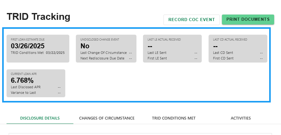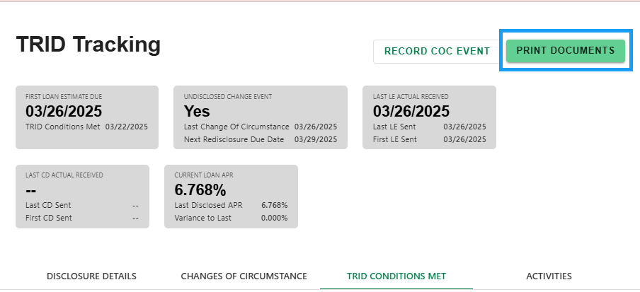 There is a Change of Circumstance section for users to manage recorded re-disclosure events. And the Print Documents button provides a quick way to generate disclosure packages.
