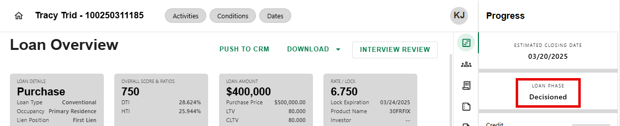 - Navigate to the Progress Item Sidesheet to review the Loan Phase.