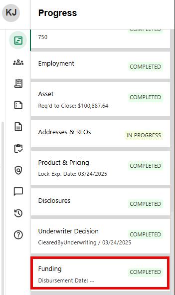 - When the loan is in the Decisioned phase, the Funding Progress Item becomes visible. Click on the Progress Item to display the details screen.