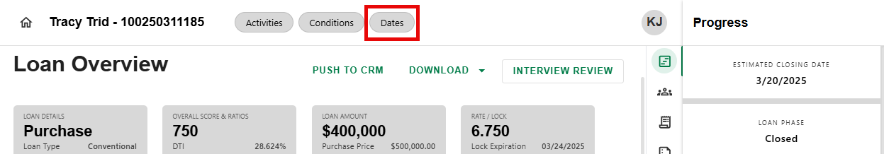 The tracking section for Funding dates can be found by clicking on the 'DATES' tab on the Loan Overview screen.