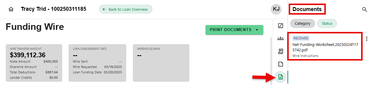 - The 'Net Funding Worksheet' can then be found in the Documents sidesheet.