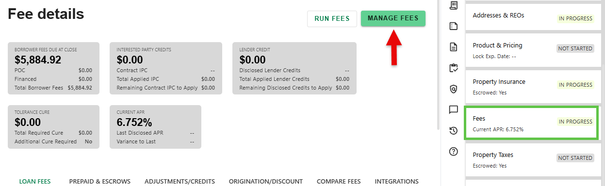 - On the Fees Progress Item details screen, click the 'MANAGE FEES' button.
