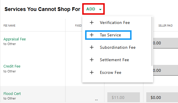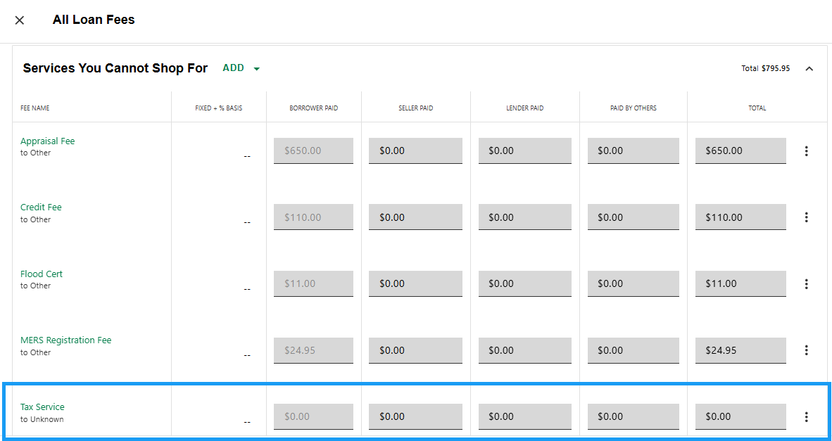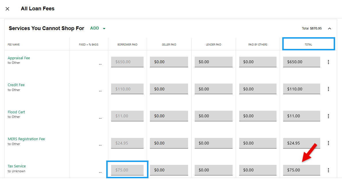 - Enter the total fee amount to the 'TOTAL' field on the right. The total will default to 'BORROWER PAID'.