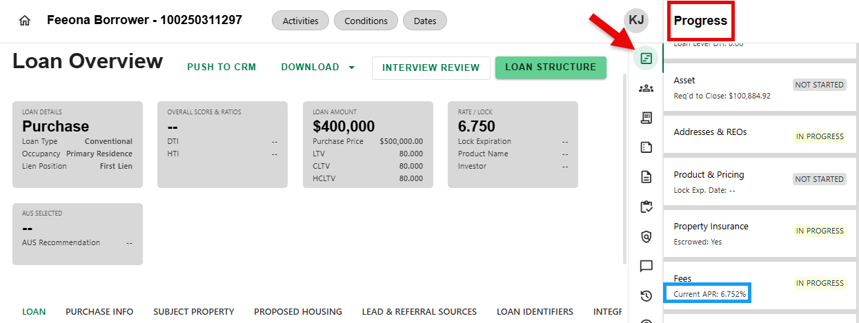The Annual Percentage Rate (APR) gives a full picture of loan costs. In Charlie, you can quickly view the APR from the Progress Item sheet.