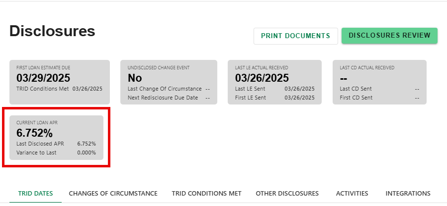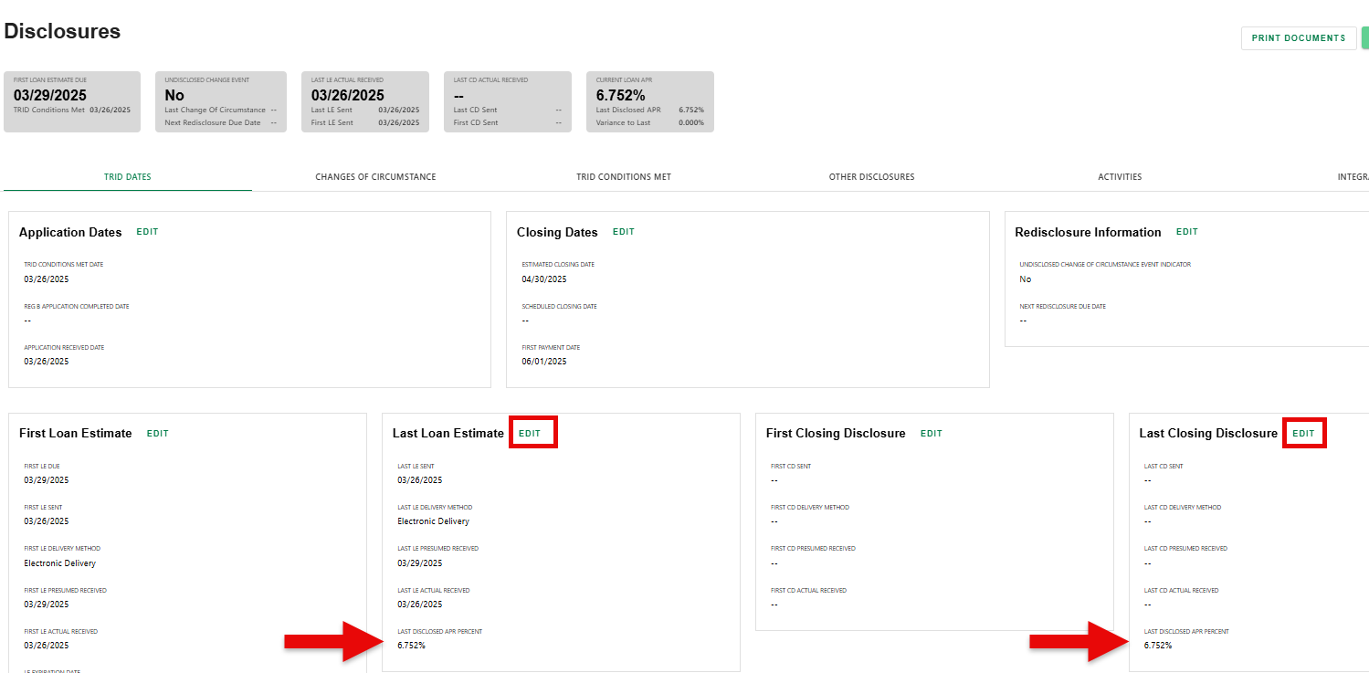 The last disclosed APR should update automatically, but in the event it needs to be updated manually, permissioned users can 'EDIT' in the 'TRID DATE' tab of the Disclosure Progress Item detail screen.