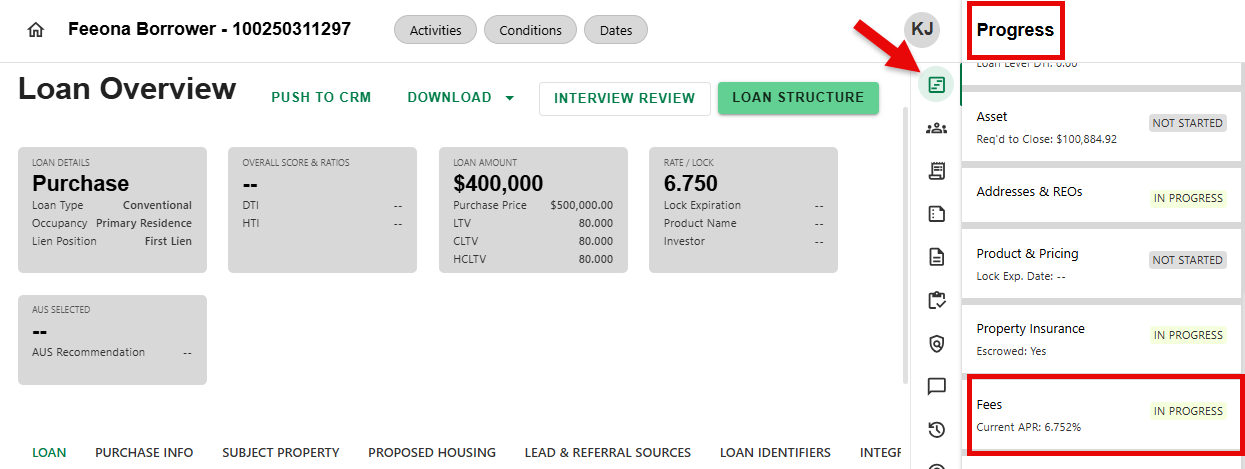- From any screen, navigate to the Progress Item sidesheet and select the Fees Progress Item.
