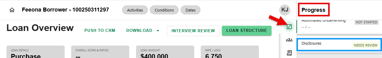 - From any screen, navigate to the Progress Item sidesheet and select the Disclosures Progress Item.
