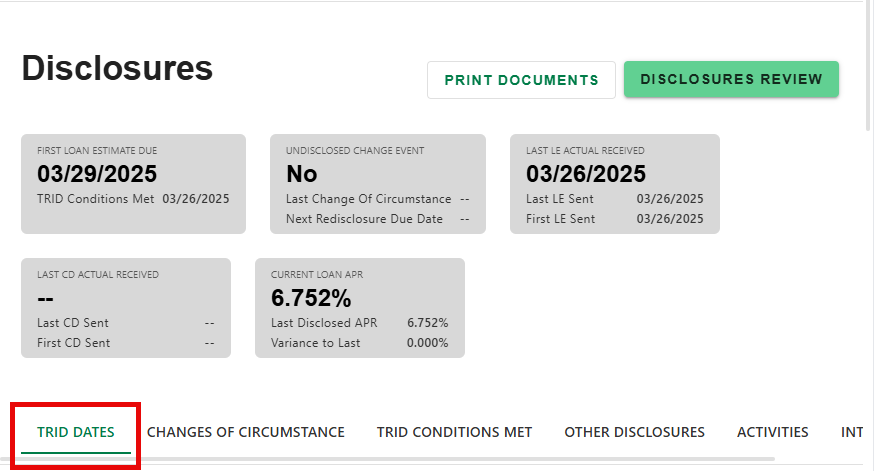 - On the Disclosures detail screen, select the 'TRID DATES' tab.