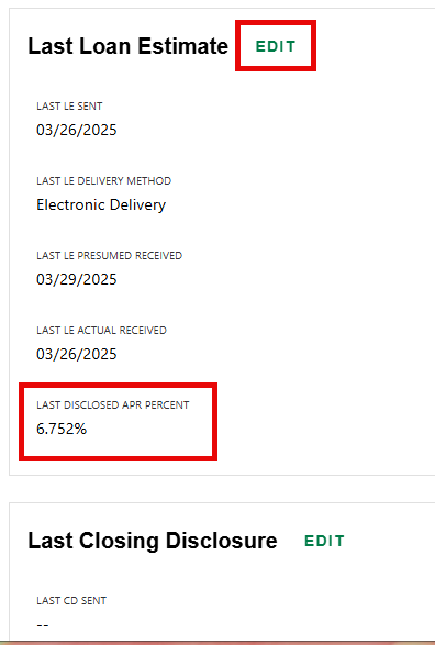 - Click 'EDIT' in the applicable Last Loan Estimate or Last Closing Disclosure section (based on last disclosure sent).