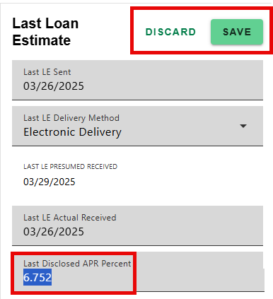 The new Last Disclosed APR will populate in the Info Cards on the Disclosure and Fees Progress Item detail screens and the variance will recalculate.
