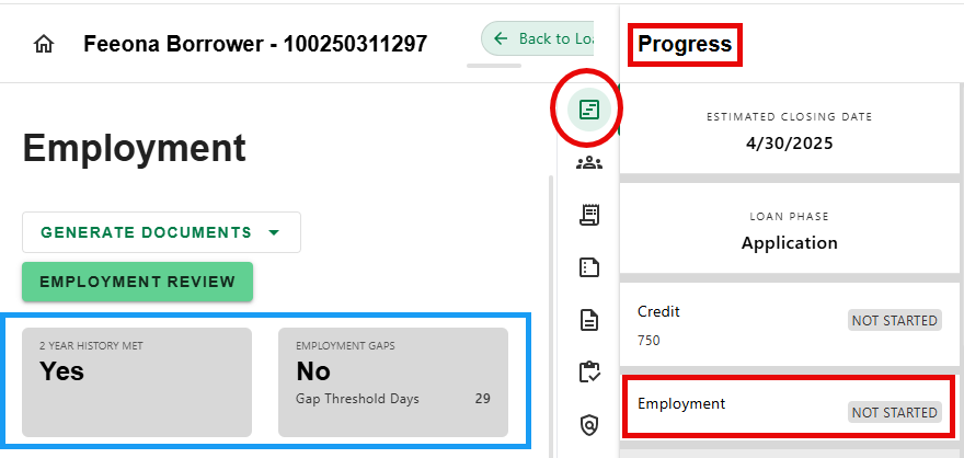 The Info Boxes on the Employment Details Progress Item screen display the determinations, including the number of gap days that influence the threshold decision.