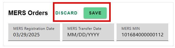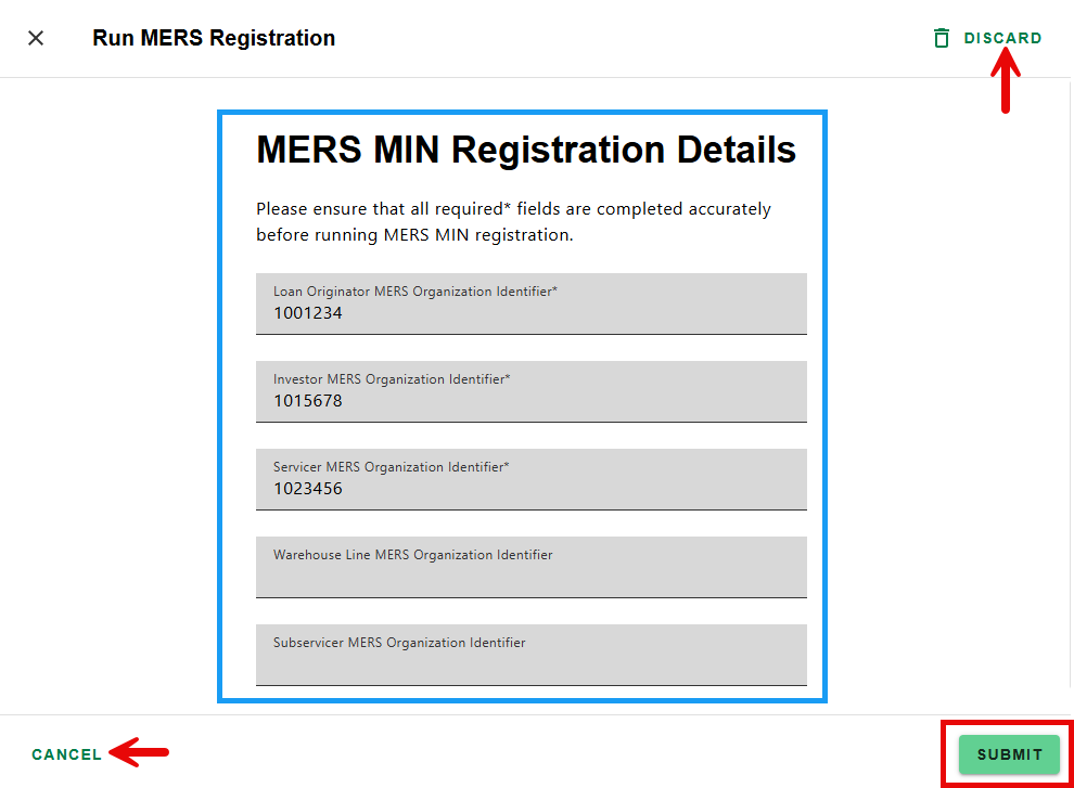 - Review to ensure all required fields are complete. If information is missing, contact your admin. Click 'SUBMIT' to initiate the registration with MERS. To go back to the previous screen, select 'CANCEL' or 'DISCARD'.