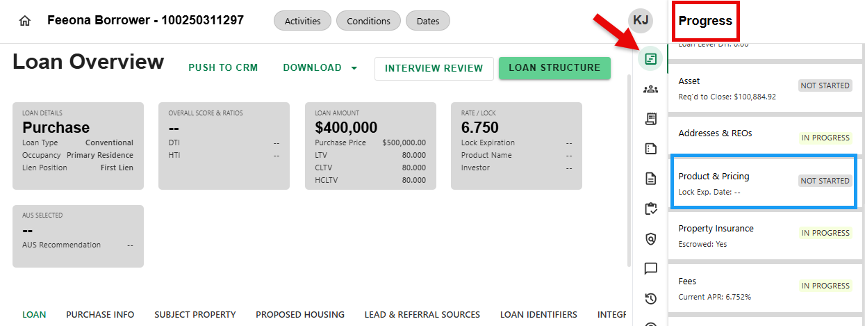 - From any screen, navigate to the Progress Item sidesheet and select the Product & Pricing Progress Item.