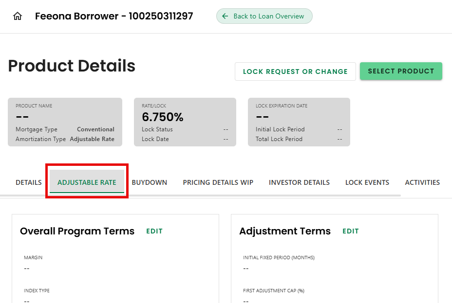 - Select the 'ADJUSTABLE RATE' tab on the Product Details screen.