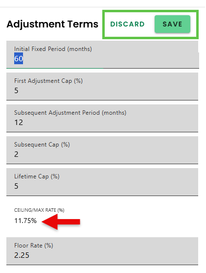 - The Adjustable Rate Terms sections can be viewed & edited. Click 'EDIT' in each of the sections to update. Once done, click 'SAVE' to apply changes or 'DISCARD' to cancel.