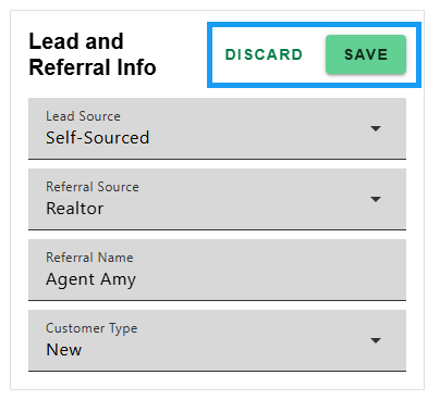 - View Lead Source, Referral Source, Referral Name and Customer Type in the Lead and Referral Info section. Click 'EDIT' to update selection. Select 'SAVE' to apply changes or 'DISCARD' to cancel.