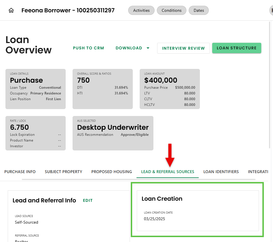 A: The Loan Creation date is located on the 'LEAD & REFERRAL SOURCES' tab on the Loan Overview Screen.