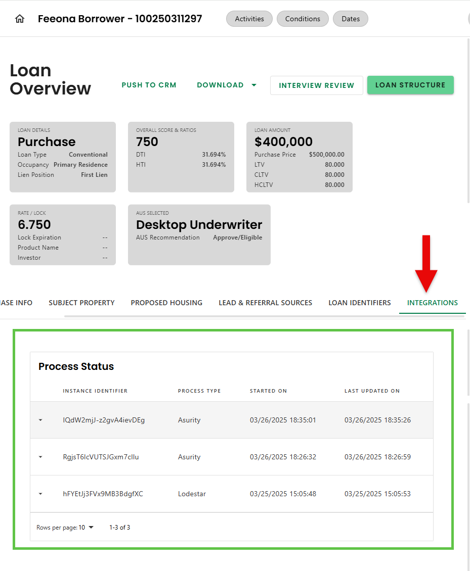 A: The 'INTEGRATIONS' tab on the Loan Overview Scre has a list of all integrations that have been run on the loan, showing the vendor, the first run and the most recent run.