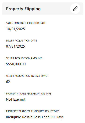 The FHA Property Transfer Eligibility Check prevents property flipping by verifying that sufficient time has passed between when the seller acquired the property and when it’s sold to a new buyer.